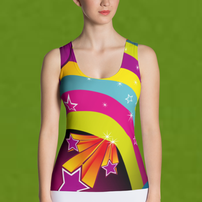 This form-fitting, sublimation tank top is a must have! Each top is cut and sewn in-house after printing, giving you a true all-over design.